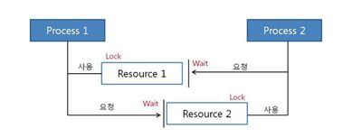 t2 : 프로세스1은 자원 2를 기다림 / 프로세스2는 자원 1을 기다림