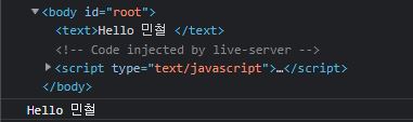 이는 index.html 에서 body 태그에 id 값으로 root 를 준 다음, 자바스크립트에서 id 값으로 root 를 가진 태그에 접근했을 때 해당 id 값을 가진 태그의 내용이 반환된 것이다.