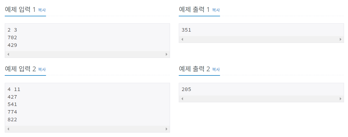 (즉, 한 번 주문한 막걸리에 남은 것을 모아서 친구들에게 다시 주는 경우는 없다. 예를 들어 5명이 3 주전자를 주문하여 1002, 802, 705ml 의 막걸리가 각 주전자에 담겨져 나왔고, 이것을 401ml 로 동등하게 나눴을 경우 각각 주전자에서 200ml, 0ml, 304ml 만큼은 버린다.) 이럴 때 K명에게 최대한 많은 양의 막걸리를 분배할 수 있는 용량 ml는 무엇인지 출력해주세요.