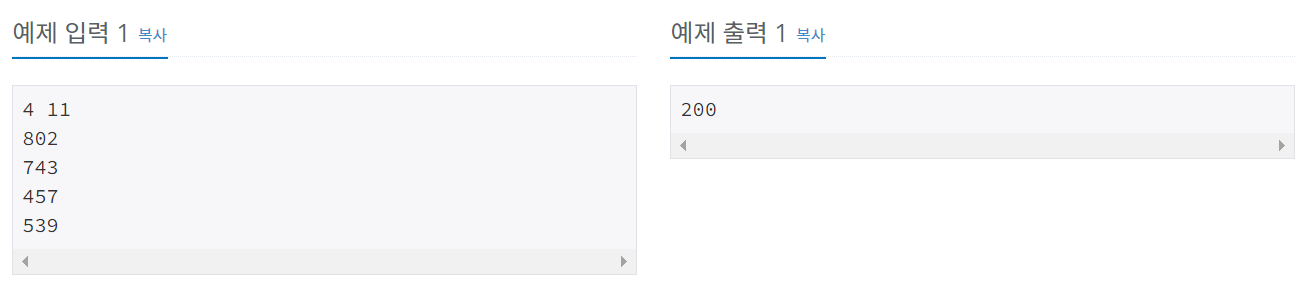 첫째 줄에는 오영식이 이미 가지고 있는 랜선의 갯수 K, 그리고 필요한 랜선의 갯수 N이 입력된다. K는 1이상 10,000 이하의 정수이고, N은 1이상 1,000,000 이하의 정수이다.