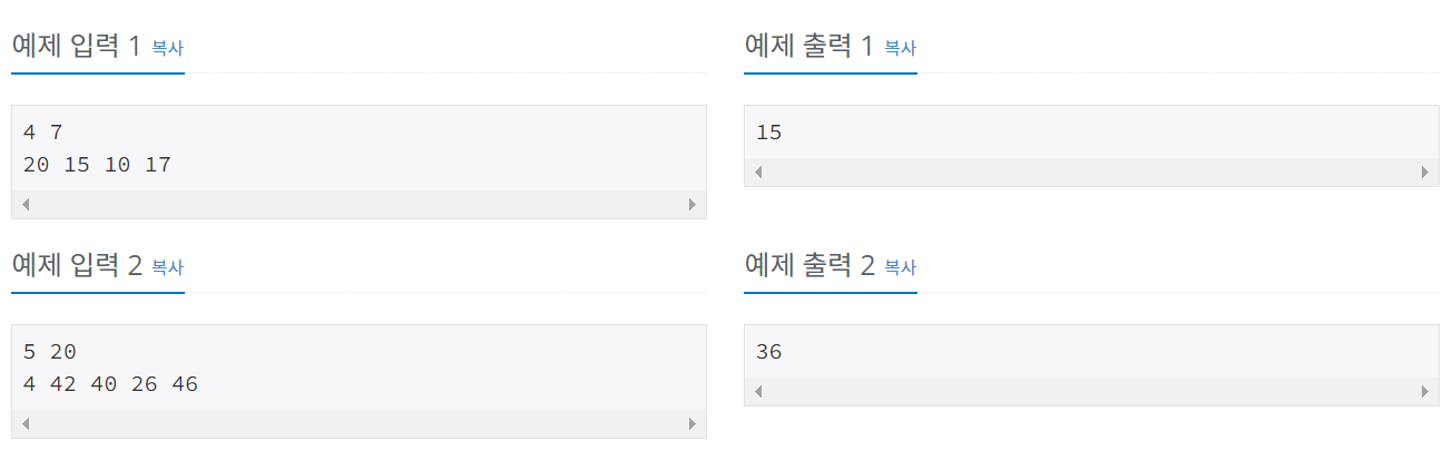 첫째 줄에 나무의 수 N과 상근이가 집으로 가져가려고 하는 나무의 길이 M이 주어진다. (1 <= N <= 1,000,000, 1 <= M <= 2,000,000,000)