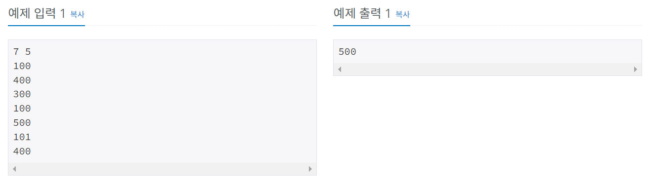 1번째 줄에는 N과 M이 공백으로 주어진다. (1 <= N <- 100,000, 1 <= M <= N)