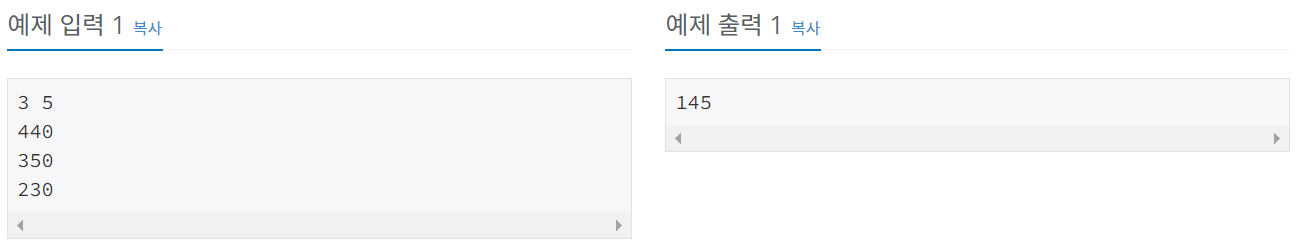 첫째 줄에 승균이가 시장에서 사 온 파의 개수 S(1 ≤ S ≤ 1,000,000), 그리고 주문받은 파닭의 수 C(1 ≤ C ≤ 1,000,000)가 입력된다. 파의 개수는 항상 파닭의 수를 넘지 않는다. (S ≤ C) 그 후, S 줄에