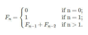 피보나치 수는 수학에서 위의 점화식으로 정의되는 수열이다. 피보나치 수는 0과 1로 시작하며, 다음 피보나치 수는 바로 앞의 두 피보나치 수의 합이 된다.