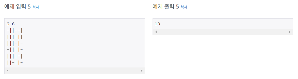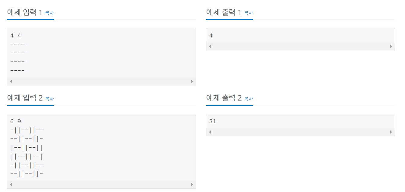 이제 '-' 와 '|' 로 이루어진 바닥 장식모양이 주어진다. 만약 두 개의 '-' 가 인접해있고, 같은 행에 있다면 두 개는 같은 나무 판자이고, 두 개의 '|' 가 인접해있고, 같은 열에 있다면 두 개는 같은 나무 판자이다.