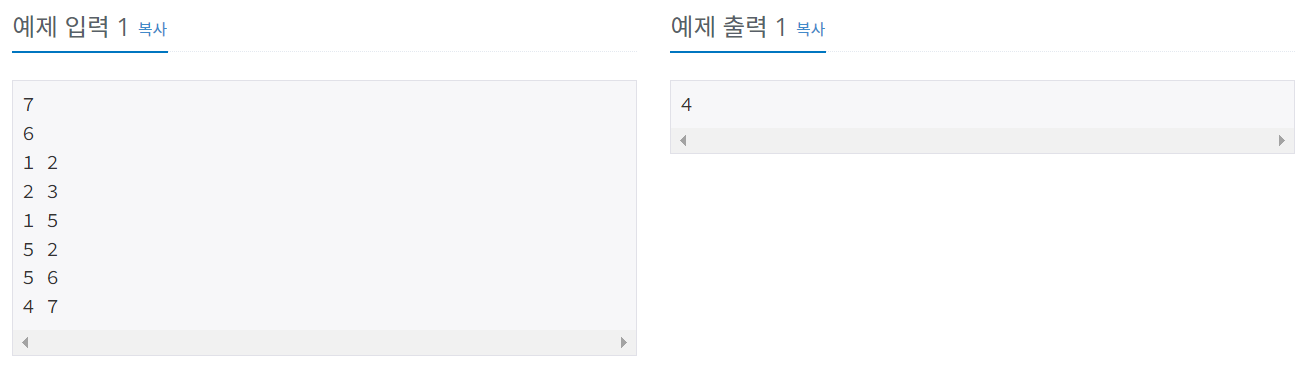 첫째 줄에는 컴퓨터의 수가 주어진다. 컴퓨터의 수는 100 이하인 양의 정수이고, 각 컴퓨터에는 1번부터 차례대로 번호가 매겨진다. 둘째 줄에는 네트워크 상에서 직접 연결되어 있는 컴퓨터 쌍의 수가 주어진다. 이어서 그 수만큼 한 줄에 한 쌍씩 네트워크 상에서 직접 연결되어 있는 컴퓨터의 번호 쌍이 주어진다.