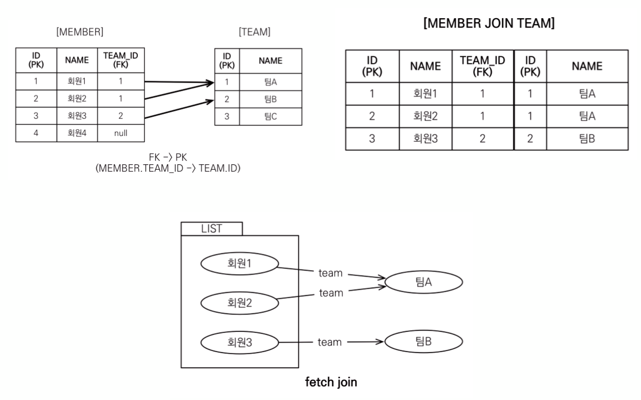 - 연관된 Entity 나 컬렉션을 SQL 한 번에 함께 조회하는 기능으로, join fetch 명령어를 사용한다.