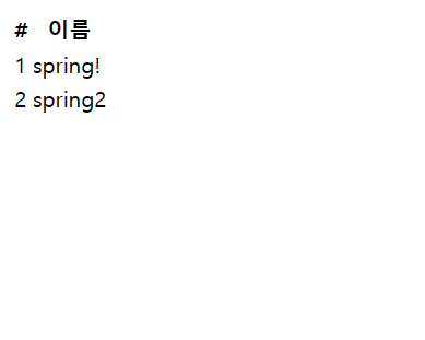여기서 태그 내부의 내용을 보면 ${member.id}, ${member.name} 를 발견할 수 있는데, 이는 현재 member 에 실려있는 Member 객체(리스트에 실려있는 하나하나의 요소 타입) 의 id, name 필드를 출력해주는 것으로 해당 데이터에 대한 접근은 getter 메소드를 통해 이루어진다.(public method)