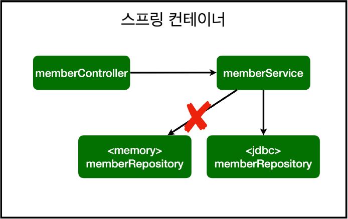 과거의 경우 Repository 를 다른 것으로 바꾸는 순간 MemberService 에서 참조하고 있는 Repository 또한 같이 바꿔줘야 했다.(어쨌든 코드의 수정이 일어나야 한다.)