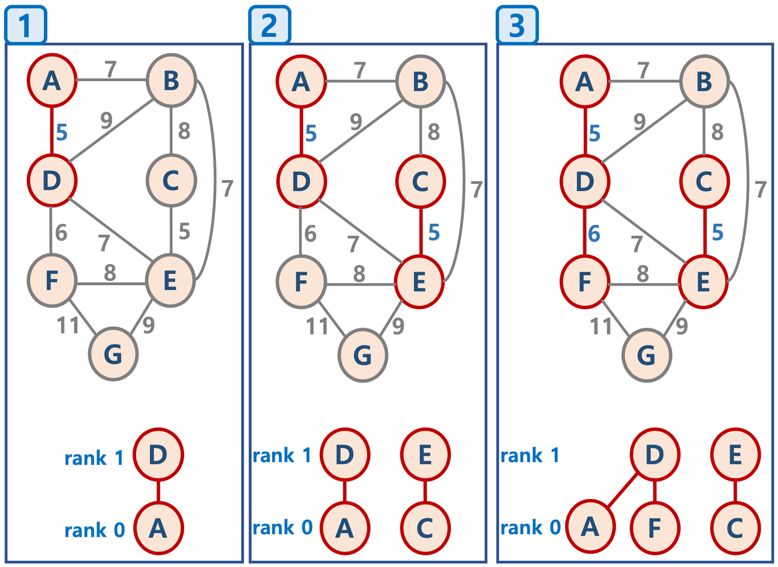 2. 모든 간선을 비용을 기준으로 정렬하고, 비용이 작은 간선부터 양 끝의 두 정점을 비교한다.