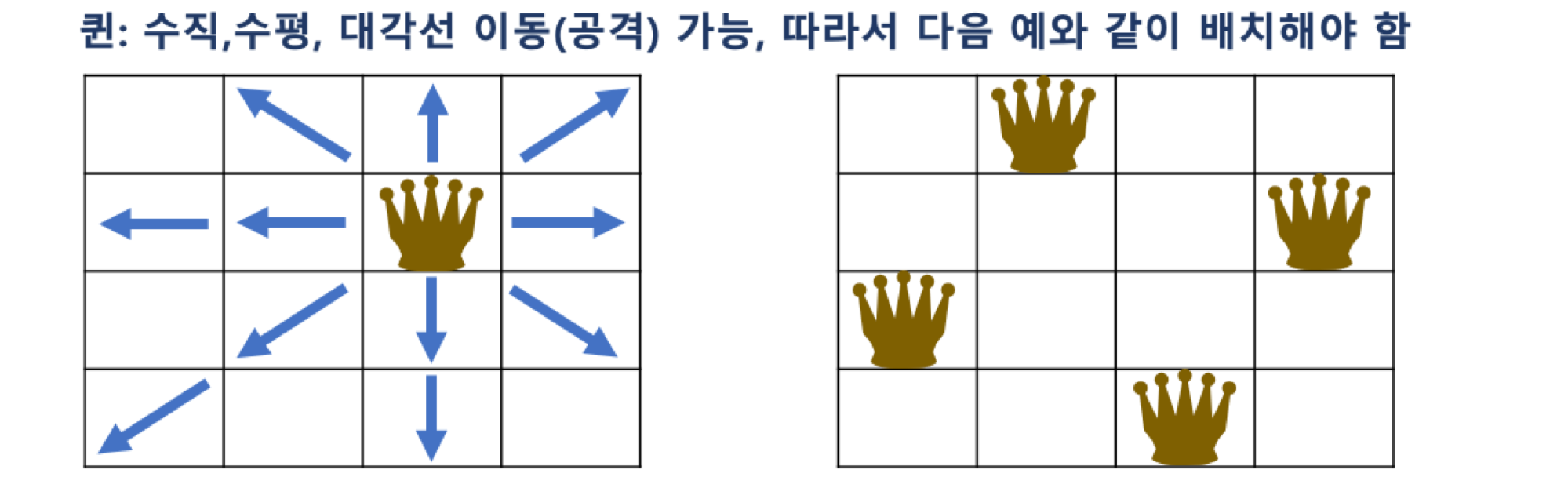 - 맨 위에 있는 행 부터 퀸을 배치하고, 다음 행에 해당 퀸이 이동할 수 없는 위치를 찾아 퀸을 배치한다.