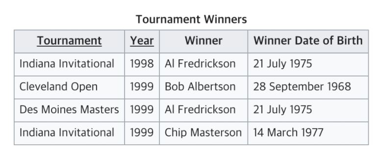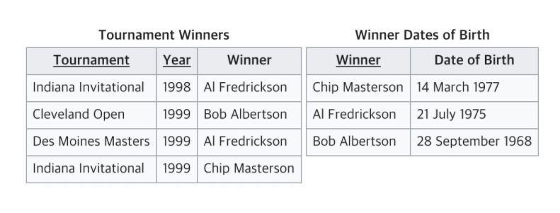 여기서 Tournament Winners 테이블은 Winner Dates of Birth 테이블의 기본키인 Winner 속성을 외래 키 값으로 가진다.