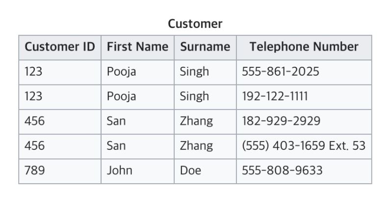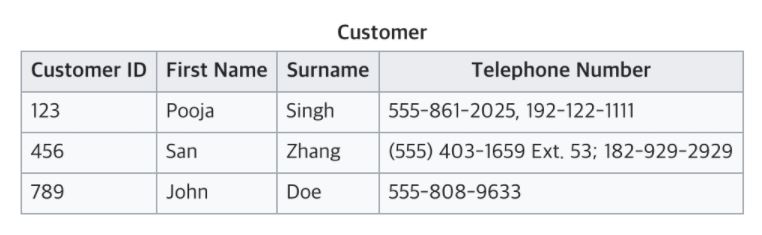 위의 고객 테이블은 한 고객이 전화번호를 여러개 가지고 있어 원자값이라고 볼 수 없다. 따라서 1NF 에 맞추기 위해서는 아래와 같이 분리할 수 있다.