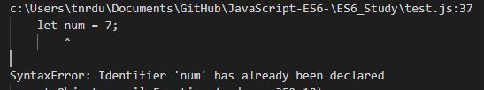 그리고 let 을 키워드로 변수를 선언하면 동일한 이름을 가지는 변수를 허용하지 않기 때문에 아래와 같이 코드를 작성할 경우 아래의 이미지와 같은 결과를 얻게 된다.
