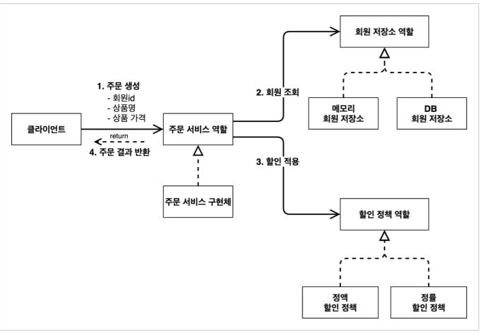 - 로미오와 줄리렛 공연을 하면 로미오 역할을 누가 할지, 줄리엣 역할을 누가 할지는 배우들이 정하는게 아니다. 이전 코드는 마치 로미오 역할(인터페이스) 을 하는 디카프리오(구현체, 배우) 가 줄리엣 역할(인터페이스) 을 하는 여자 주인공(구현체, 배우) 을 직접 초빙하는 것과 같다.(OrderServiceImpl 이 할인 정책인 FixDiscountPolicy 을 직접 선택하였다.)
