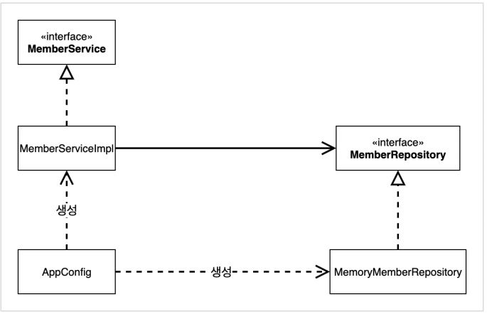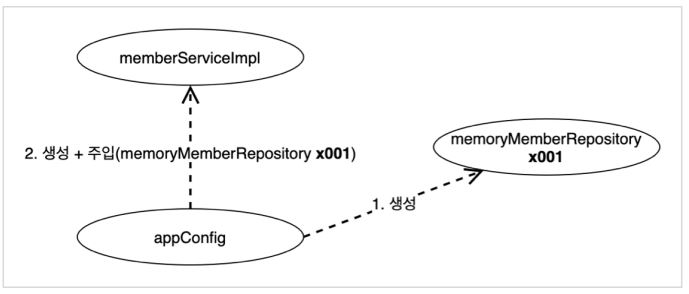 - AppConfig 객체는 MemoryMemberRepository 객체를 생성하고, 그 참조값을 MemberServiceImpl 객체 생성자에게 넘겨준다.