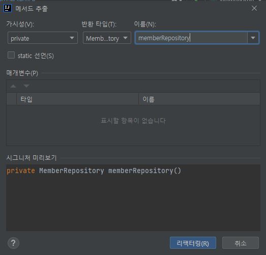 이 창에서 반환 타입은 MemberRepository 로 바꿔주고, 이름은 memberRepository 로 해준 다음 리팩터링을 클릭하면 이전에 작성했던 MemoryMemberRepository 객체를 만드는 생성자를 호출하는 메소드가 반환타입은 MemberRepository, 이름은 memberRepository 로 생성된다.