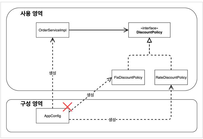 - 이제 할인 정책을 변경해도 어플리케이션의 구성 역할을 담당하는 AppConfig 만 변경하면 된다. 클라이언트 코드인 OrderServiceImpl 를 포함해서 "사용 영역" 의 어떤 코드도 변경할 필요가 없다.