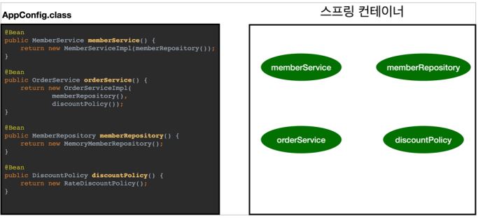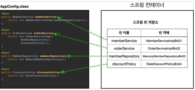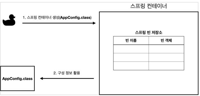 - 스프링 컨테이너는 파라미터로 넘어온 설정 클래스 정보를 사용해서 스프링 빈을 등록한다.