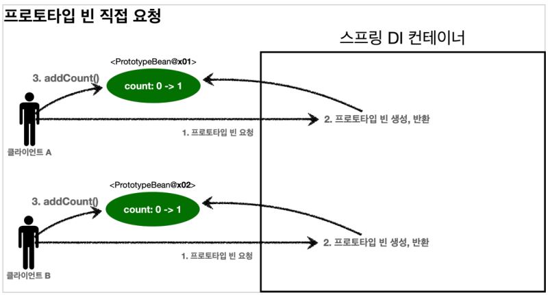 + 참고 : 여러 빈에서 같은 프로토타입 빈을 주입 받으면, 주입 받는 시점에 각각 새로운 프로토타입 빈이 생성된다.