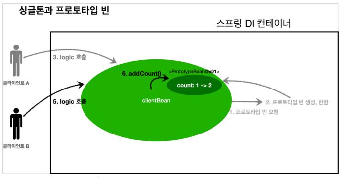 - 1. clientBean 은 의존관계 자동 주입을 사용한다. 주입 시점에 스프링 컨테이너에 프로토타입 빈을 요청한다.