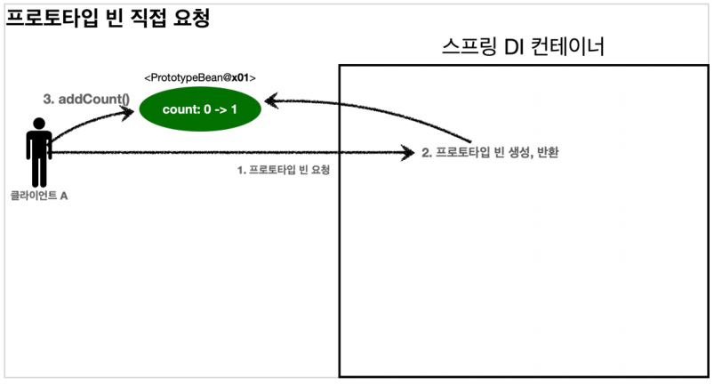 - 2. 스프링 컨테이너는 프로토타입 빈을 생성해서 clientBean 에 반환한다. 프로토타입 빈의 count 필드 값은 0이다.