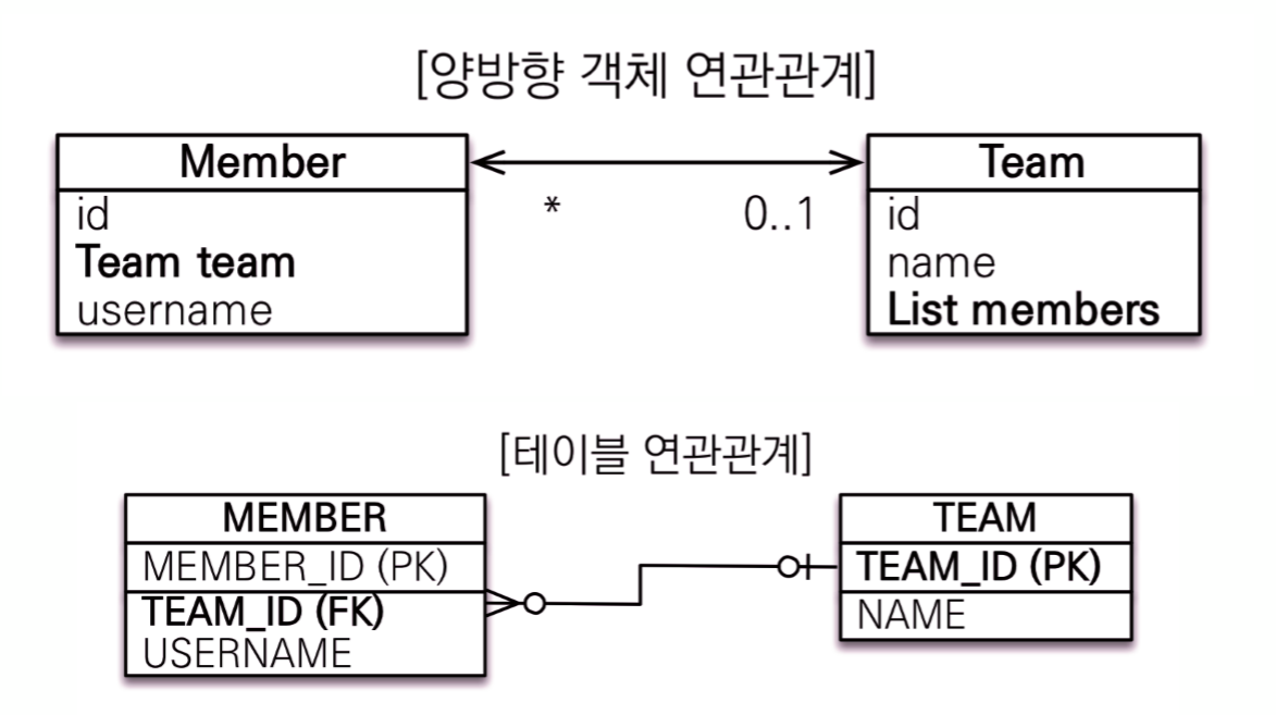 -> 사실상 단방향 연관관계가 2개 있는 것이다. 즉, 객체의 양방향 관계가는 사실 양방향 관계가 아니라 서로 다른 단방향 관계 2개로 이루어져 있는 것이다.