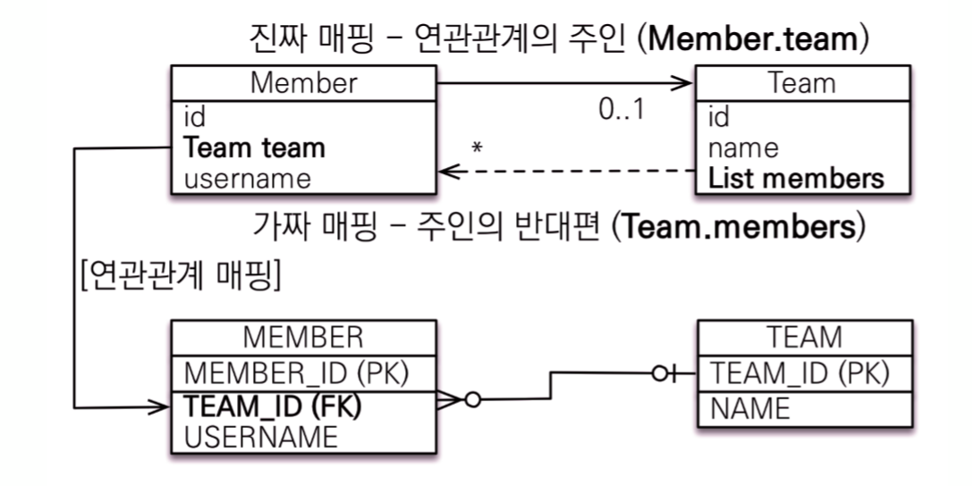 둘 중 하나로 외래 키를 관리해야 한다. : Member, Team 두 도메인 클래스 중에서 어떤 도메인 클래스로 외래 키 값을 관리할 지 '주인' 을 결정해야 한다는 것이다.