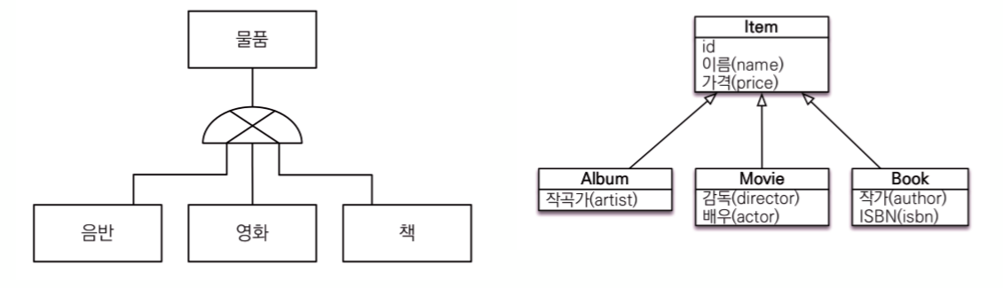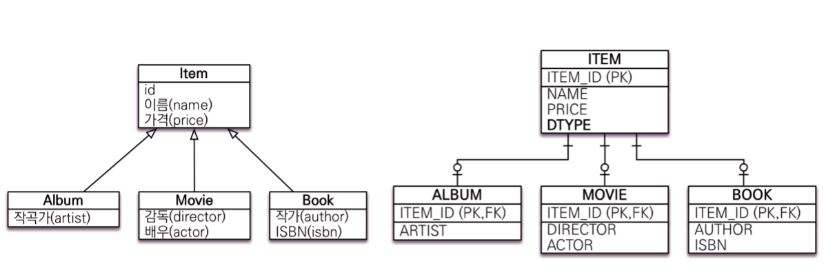 * 테이블 입장에서는 상속 관계인 논리 모델을 물리 모델로 구현하는데 3가지 방법이 있으나, 객체의 경우는 애초에 상속관계를 지원하기 때문에 그냥 다 똑같다.(테이블에서 어떤 방법을 활용하든 JPA 에서는 다 매핑이 가능하다.)