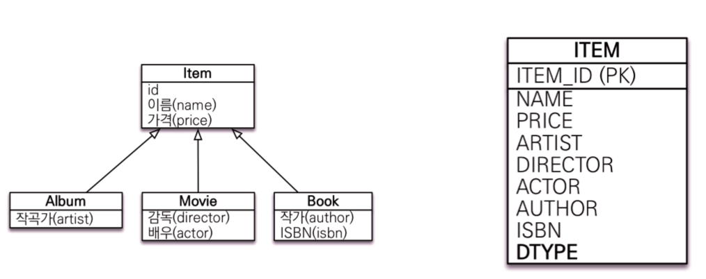 ) // 한 테이블에 슈퍼 타입과 서브 타입 테이블의 필드들이 모두 생성되었다.
