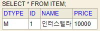 - 테이블 조인 전략의 경우 어차피 도메인 별로 테이블이 분리되어 있기 때문에 name, price 와 같은 공통 속성의 데이터를 삽입해도 DTYPE 분류 없이도 구분할 수 있다.