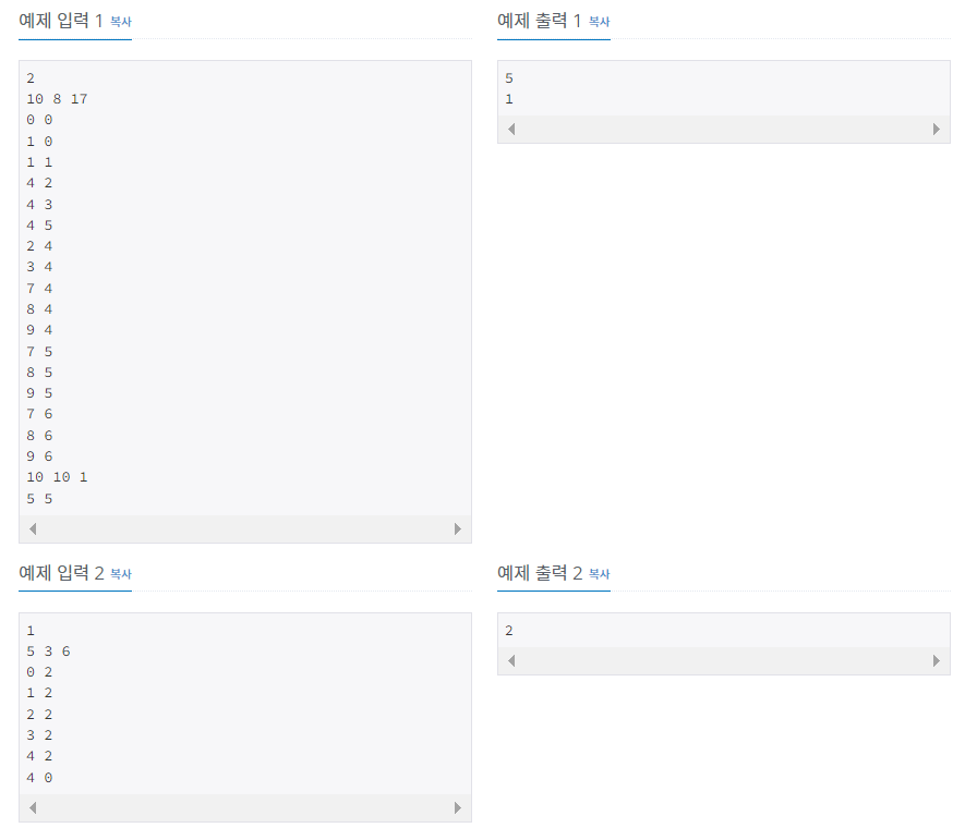 입력의 첫 줄에는 테스트 케이스의 갯수 T가 주어진다. 그 다음 줄부터 각각의 테스트 케이스에 대해 첫째 줄에는 배추를 심은 배추밭의 가로 길이 M (1 <= M <= 50) 과 세로 길이 N (1 <= N <= 50), 그리고 배추가 심어져 있는 위치의 갯수 K (1 <= K <= 2,500) 이 주어진다. 그 다음 K줄에는 배추의 위치 X (0 <= X <= M - 1), Y (0 <= Y <= N - 1) 가 주어진다.