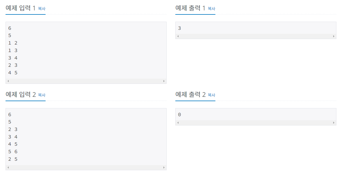 예제 1의 경우 2와 3은 상근이의 친구이다. 또, 3과 4는 친구이기 때문에, 4는 상근이의 친구의 친구이다. 5와 6은 친구도 아니고, 친구의 친구도 아니다. 따라서 2, 3, 4 3명의 친구를 결혼식에 초대