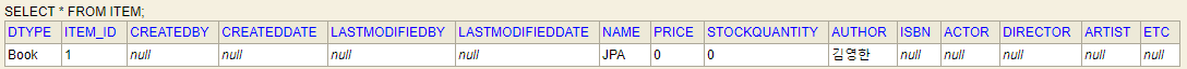 위의 콘솔 select 결과를 통해 슈퍼 타입 테이블이 단일 테이블 전략으로 생성되었고, 데이터 또한 잘 삽입 되었으며, 데이터가 삽입되지 않은 필드들은 null 값이 들어가 있는 것을 확인할 수 있다.(not null 제약조건 사용불가)