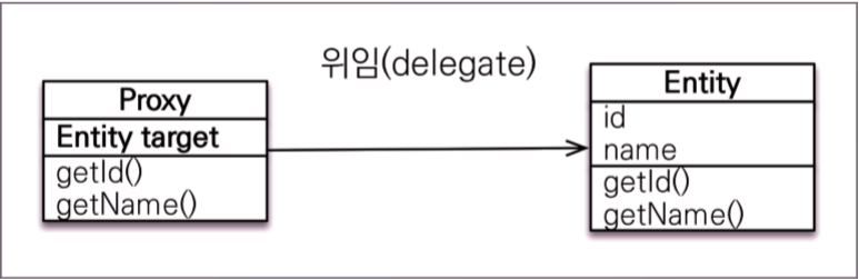 - 실제 클래스를 상속받아 만들어진다, 그래서 실제 클래스와 겉모양이 똑같다.(개발자가 직접 손대지 않아도 Hibernate 가 내부에 있는 프록시 라이브러리를 활용하여 만들어내게 된다.)