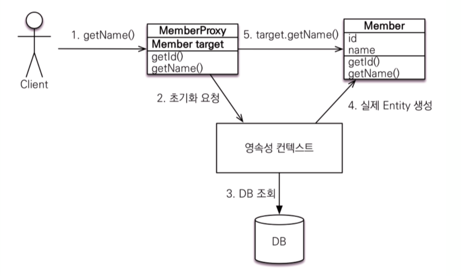 // 프록시 객체를 통해 실제 클래스의 Entity 를 참조하여 데이터를 가져온다.