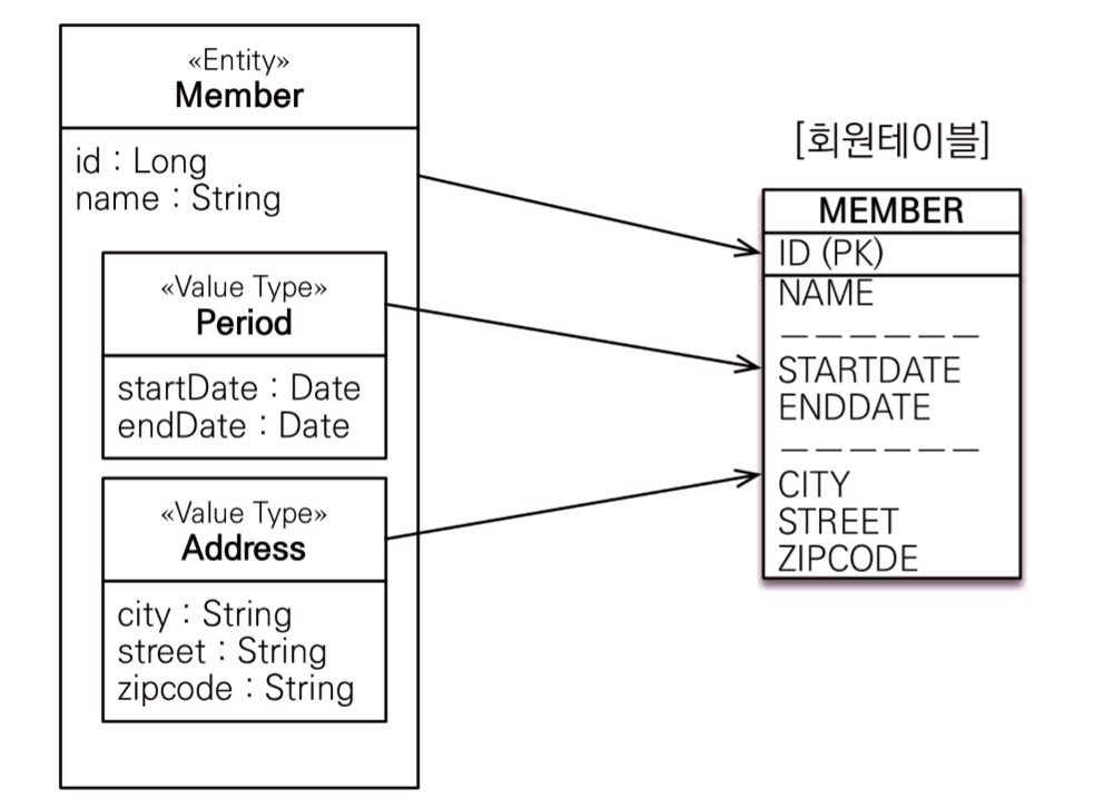 JPA 에서는 @Embeddable 어노테이션(값 타입을 정의하는 곳에 표시), @Embedded 어노테이션 (값 타입을 사용하는 곳에 표시) 을 만들어서 사용한다.