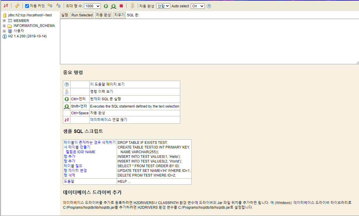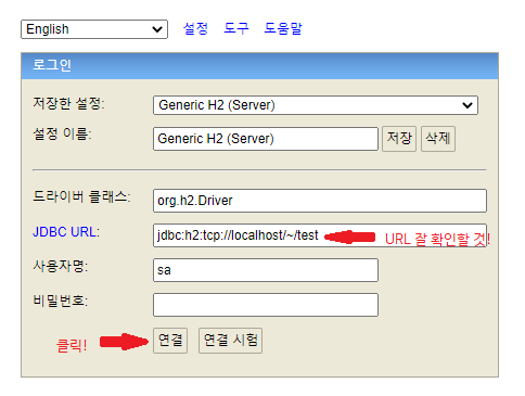 설치가 끝난 경우 H2 console 을 실행시킨 후 아래의 그림에서 연결 버튼을 클릭해 데이터베이스가 정상적으로 잘 연결되는지 확인해준다.