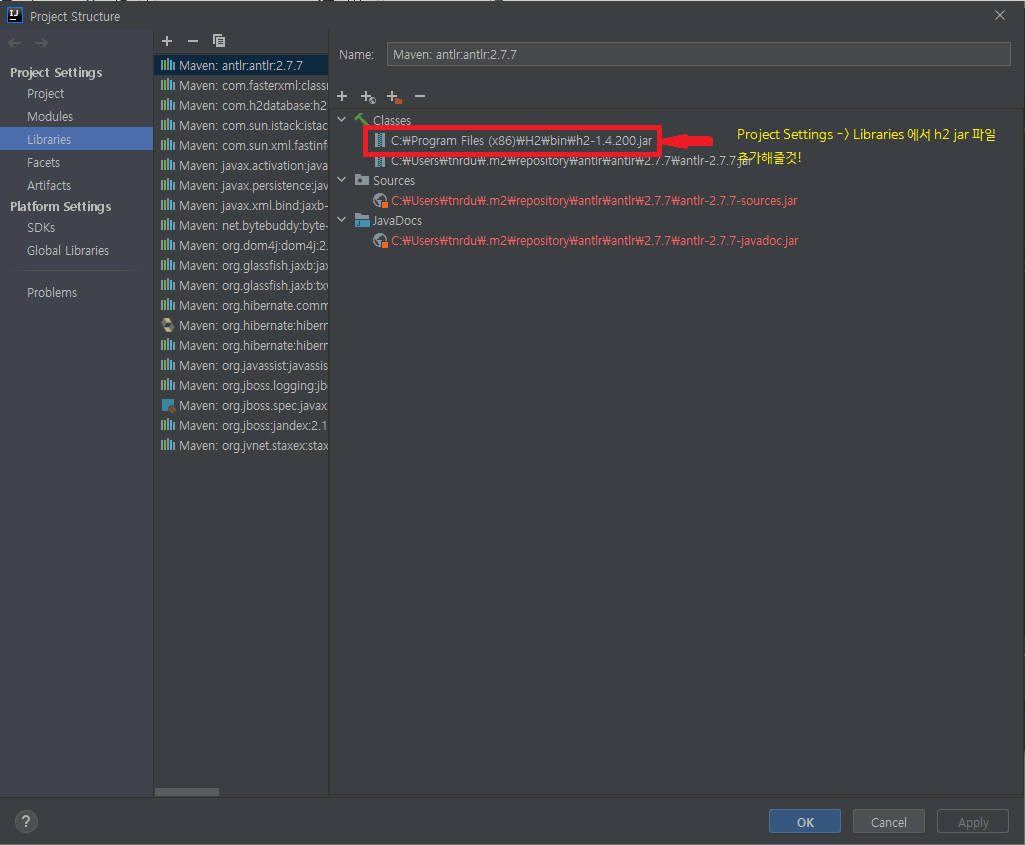 추가로 JPA - H2 데이터베이스 간 연결을 위해 아래 그림과 같이 설치한 h2 폴더에 있는 jar 파일을 Project Settings -> Libraries 에 추가해주자.