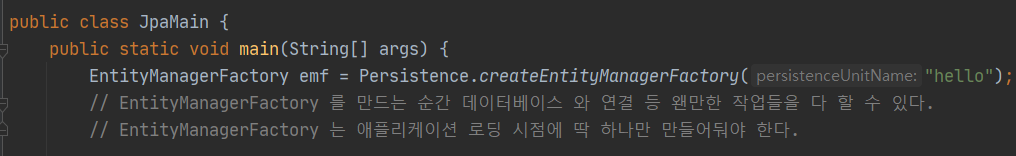 앞전에 작성한 글에서 persistence.xml 을 통해 JPA 의 설정을 할 수 있다. 해당 파일에서 JPA 가 설정 정보를 조회하고 나면 아래의 소스 코드와 같이 EntityManagerFactory 클래스의 객체를 생성 시킬수 있다.