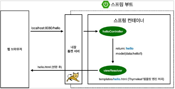 웹 브라우저에서 localhost:8080/hello 주소를 서버 측에 전달 -> 스프링 부트의 내장 톰캣에서 주소를 전달받음