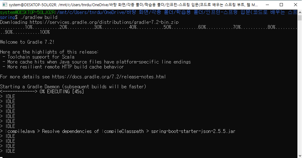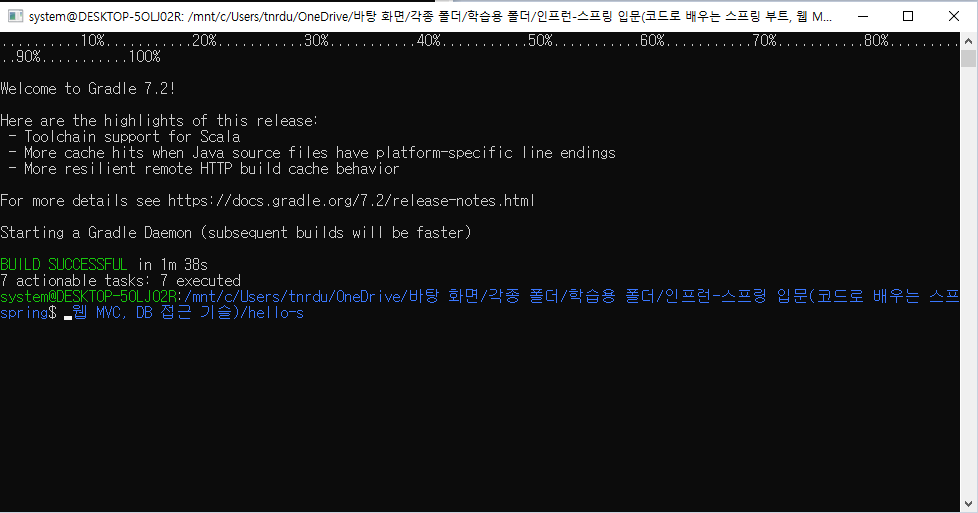 리눅스 또는 깃 배쉬를 통해 hello-spring 폴더 내부에서 ./gradlew build 명령을 입력하면 프로젝트가 빌드된다.