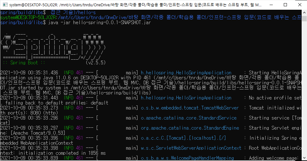 마지막으로 java -jar hello-spring-0.0.1-SNAPSHOT.jar 명령을 실행하면 해당 파일을 통해 spring 이 실행되는 것을 확인할 수있다.